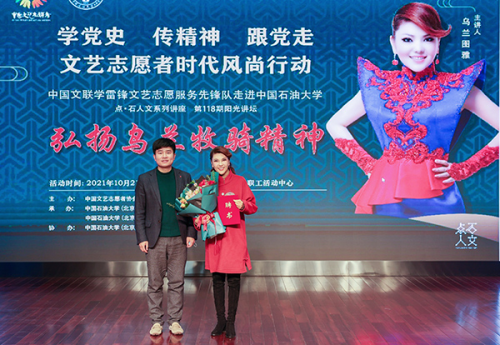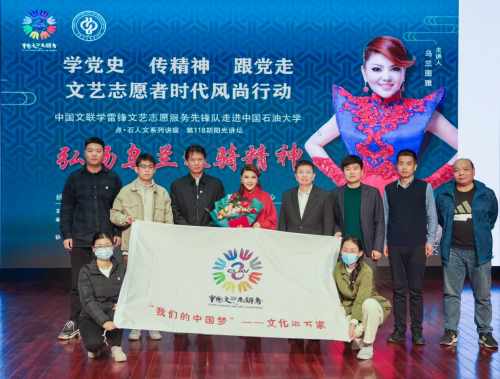 10月21日下午,“學(xué)黨史 傳精神 跟黨走 文藝志愿者時(shí)代風(fēng)尚行動(dòng)”中國(guó)文聯(lián)學(xué)雷鋒文藝志愿服務(wù)先鋒隊(duì)做客中國(guó)石油大學(xué)(北京)點(diǎn)·石人文系列講座暨第118期陽(yáng)光講壇,宣講烏蘭牧騎精神。中國(guó)文聯(lián)文藝志愿服務(wù)中心副主任、中國(guó)文藝志愿者協(xié)會(huì)副秘書(shū)長(zhǎng)李巖,中國(guó)石油大學(xué)(北京)副校長(zhǎng)金衍,團(tuán)委、體育與人文藝術(shù)學(xué)院等部門(mén)和學(xué)院相關(guān)負(fù)責(zé)人以及300余名師生,現(xiàn)場(chǎng)聆聽(tīng)了蒙古族青年歌唱家、全國(guó)學(xué)雷鋒先進(jìn)典型“最美志愿者”榮譽(yù)稱(chēng)號(hào)獲得者烏蘭圖雅帶來(lái)的精彩報(bào)告。