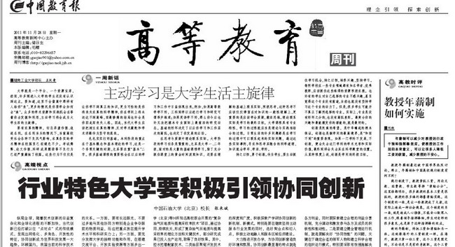 11月28日出版的《中國(guó)教育報(bào)》第5版高等教育周刊刊發(fā)了中國(guó)石油大學(xué)校長(zhǎng)張來(lái)斌的署名文章《行業(yè)特色大學(xué)要積極引領(lǐng)協(xié)同創(chuàng)新》。